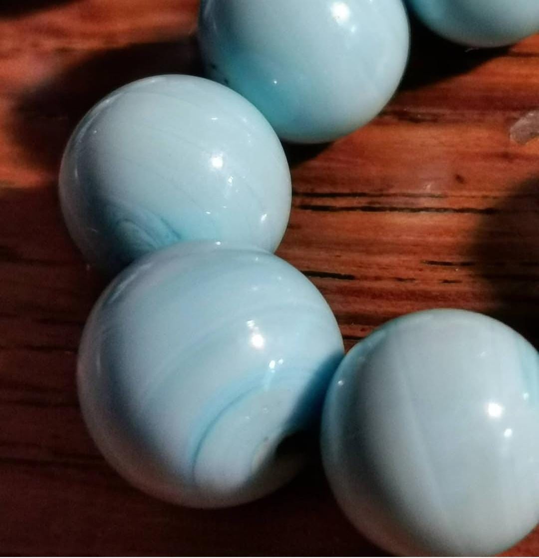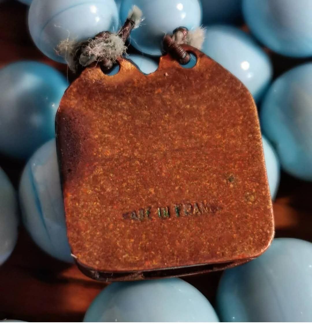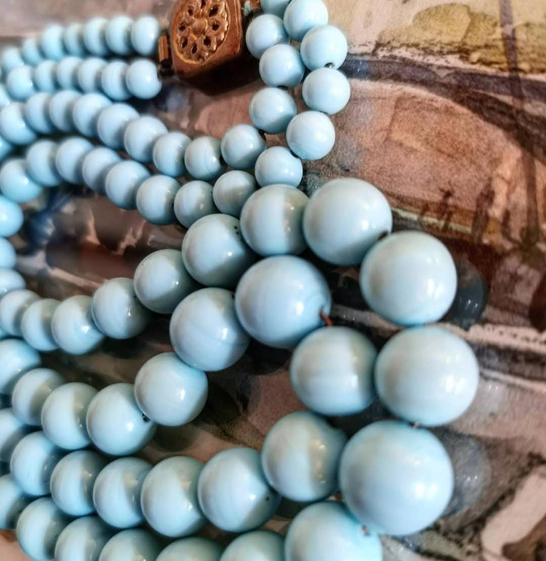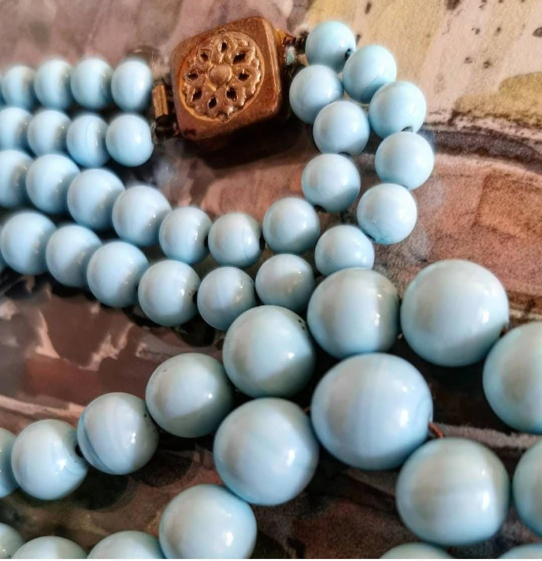 Vintage Louis Rousselet Turquoise Blue Glass Swirl graduated two strand Beaded Necklace with Brass Box Clasp, Made in France.